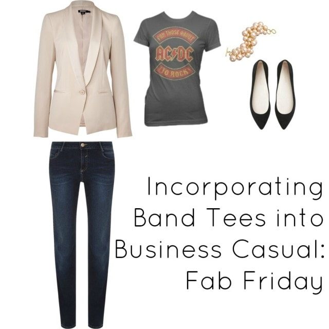 Fab Friday: Fridays are usually more casual than the rest of the week, and a great time to try out a band tee shirt in your casual or creative workplace. The key is to keep the rest of the look polished. Paired with crisp dark jeans in a slim but not tight silhouette, the tee shirt doesn’t look as bummy. Topped with a tux-inspired blazer with strong lines, the tee shirt is an accent and not the focal point. Pointed-toe flats and a feminine bracelet keep the look from looking too rock-n-roll and is a fun contrast to the band you are featuring.