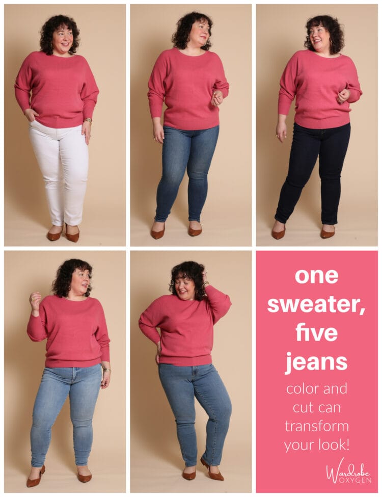 I decided to photograph a variety of jeans in my wardrobe with the same sweater so you could also see how changing the color or wash of your jeans could change your life… or at least your wardrobe.