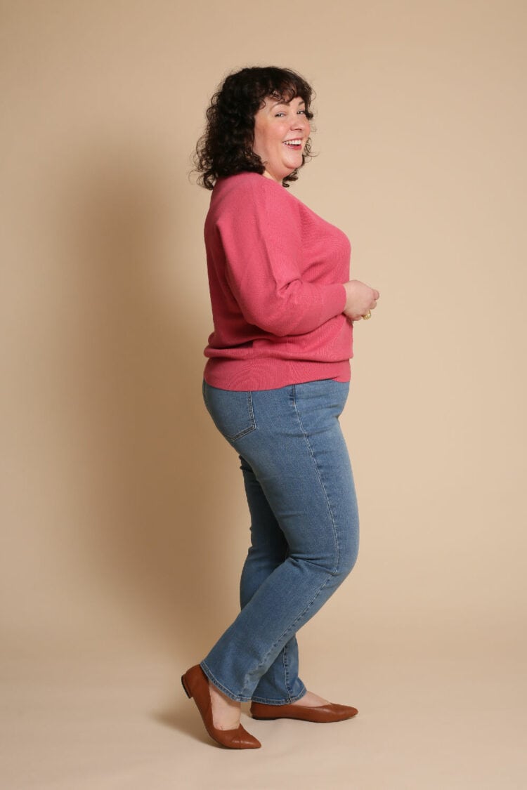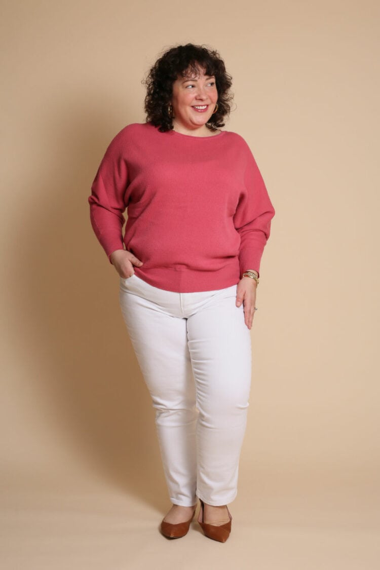 I previously wore this coral batwing sweater with white jeans. I was surprised how much I liked the sweater. When I got home from the shoot, I kept on the sweater but changed from the white jeans to a faded pair in a different silhouette. It was astounding how different the sweater looked, and I looked, with a change of denim wash. It was such a fantastic example of how the wash and cut of your jeans can really transform any look.
