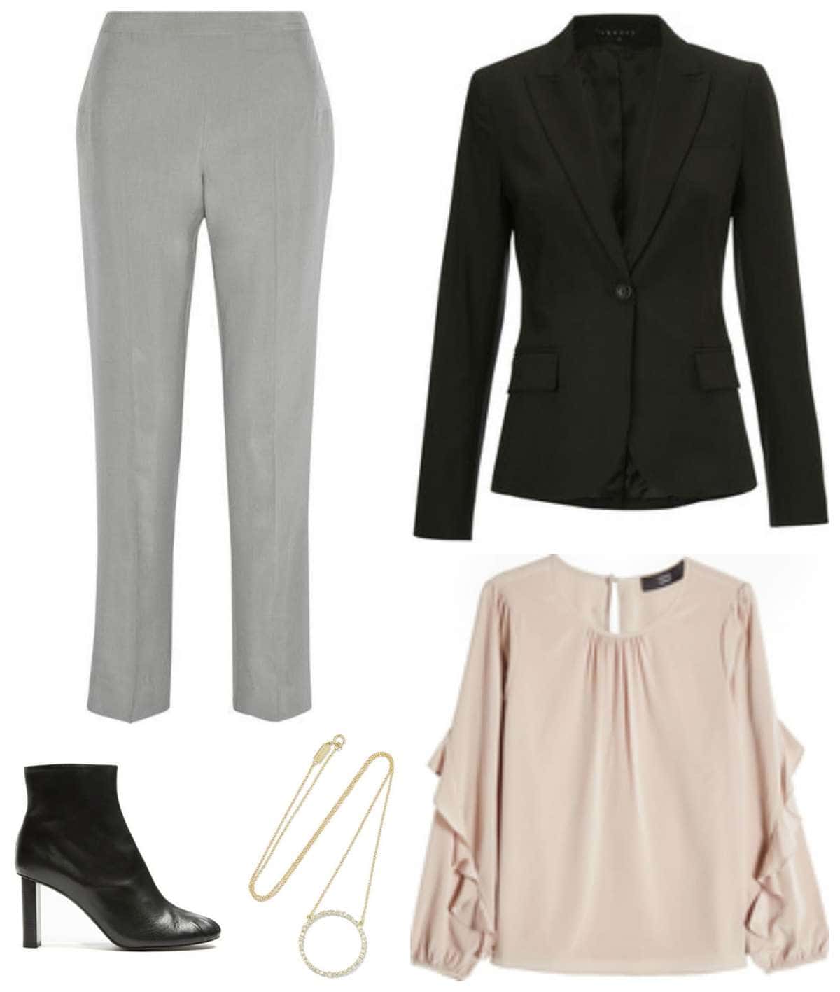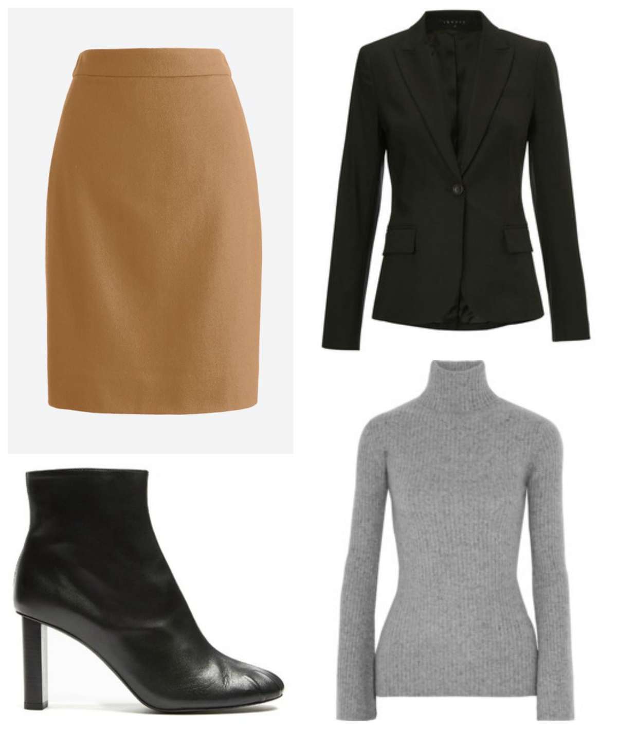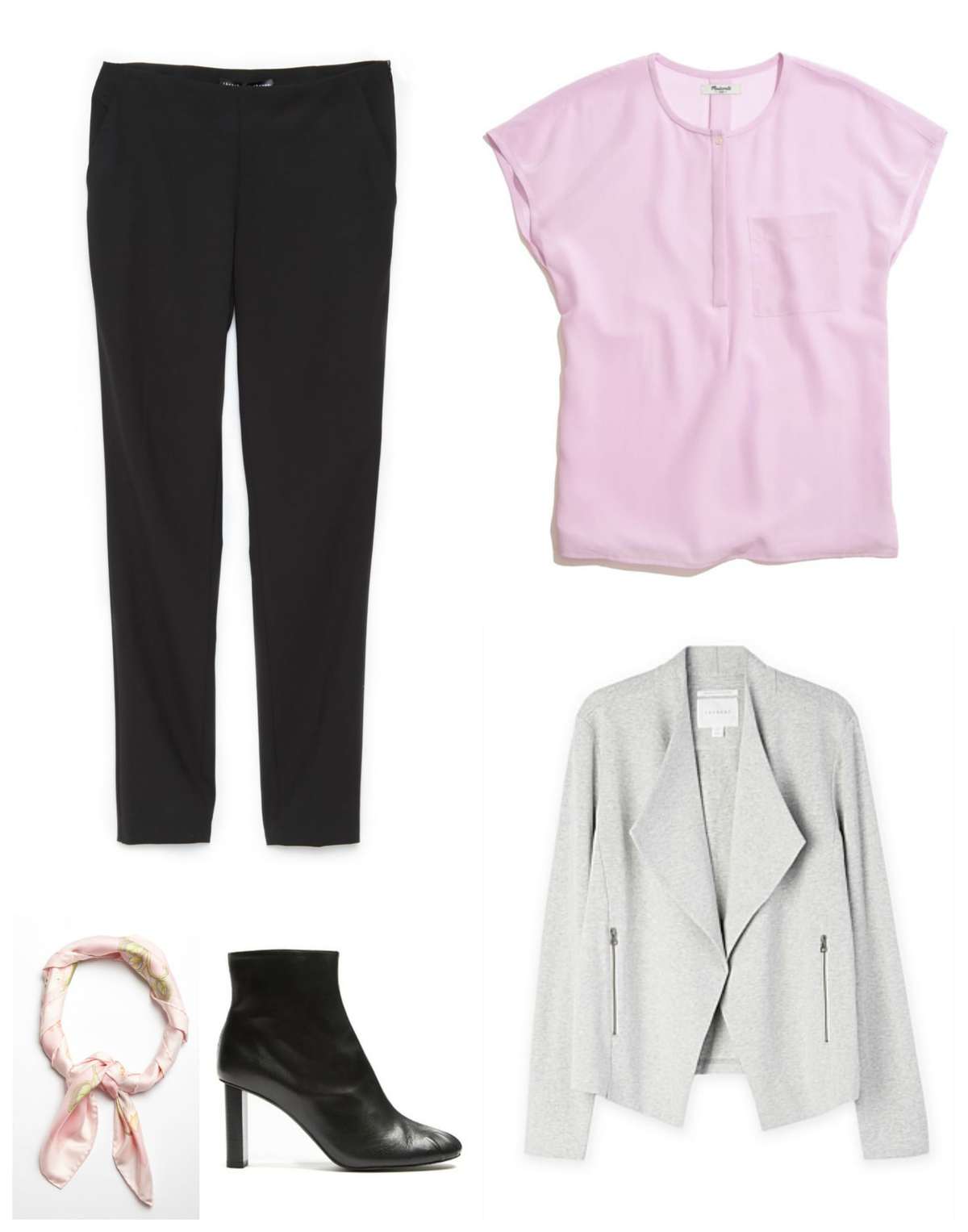 grey jacket | cream jacket | black jacket | scarf | necklace | black pants | grey pants | cream pants | berry blouse | cream blouse | black blouse | silk tee | pink sweater | grey sweater | black boots | pumps | tote | black dress | red dress | skirt