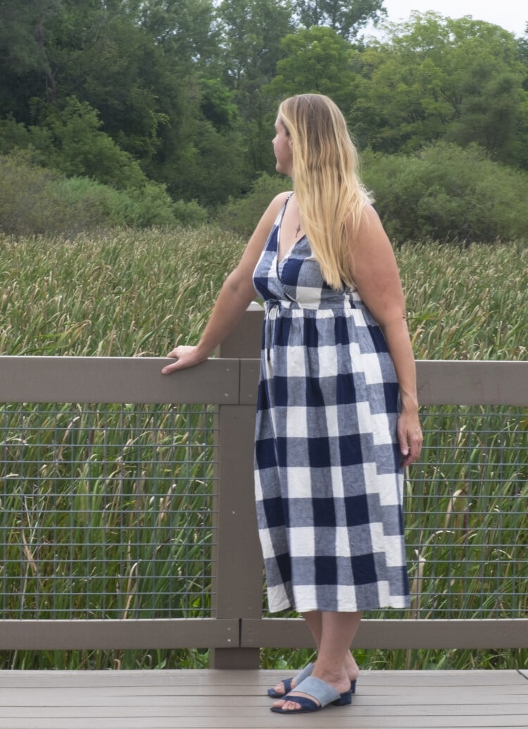 The Lincoln dress has the same cross-over front and underbust drawstring as the Dawn Dress and Dawn Jumper but without sleeves. I saw a large-scale blue gingham fabric on the website in the summer of 2020 that I really liked, but nothing was left in my size.  I watched resale sites until I was able to snag a Lincoln Dress from Poshmark this past January in the blue gingham fabric that I liked.