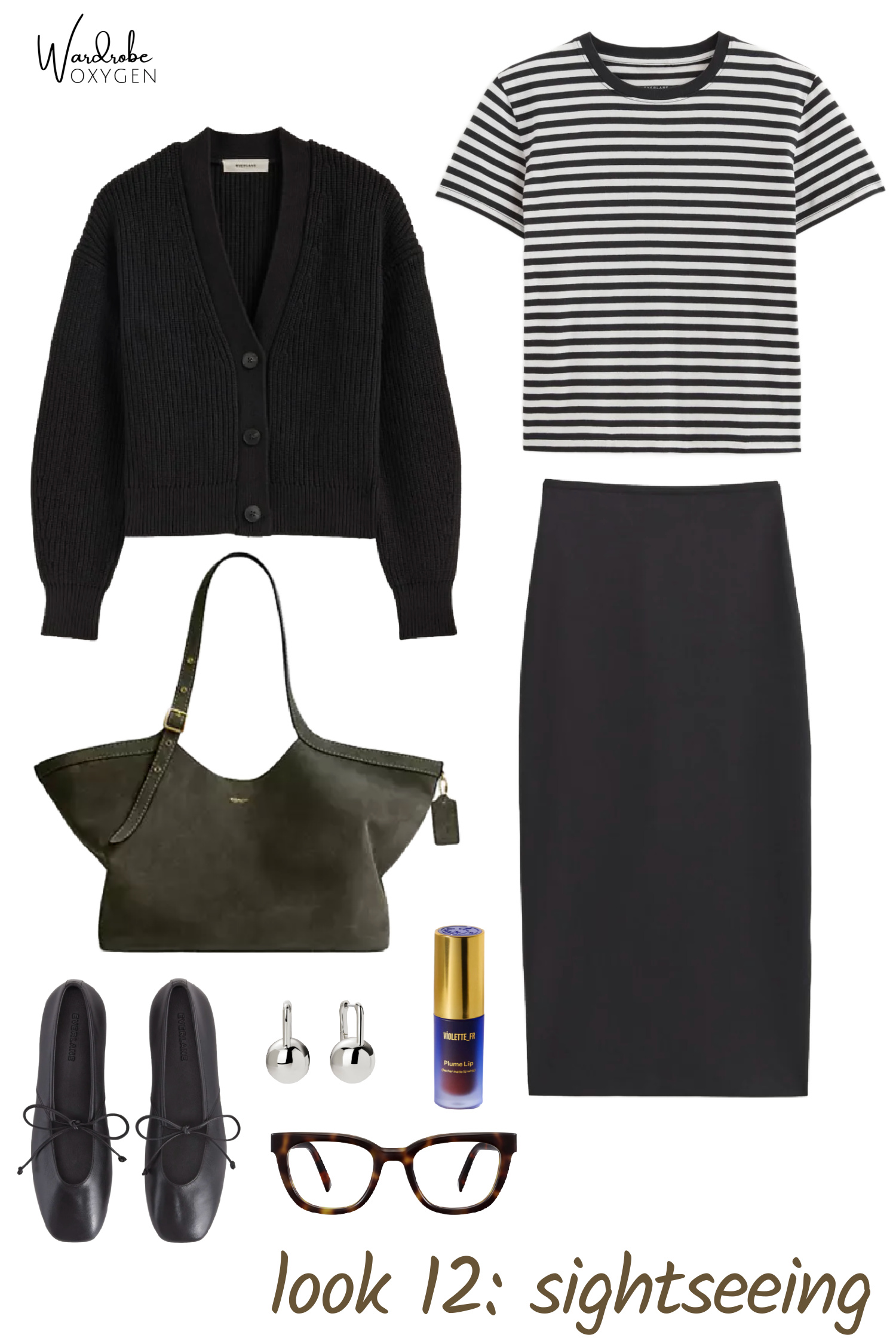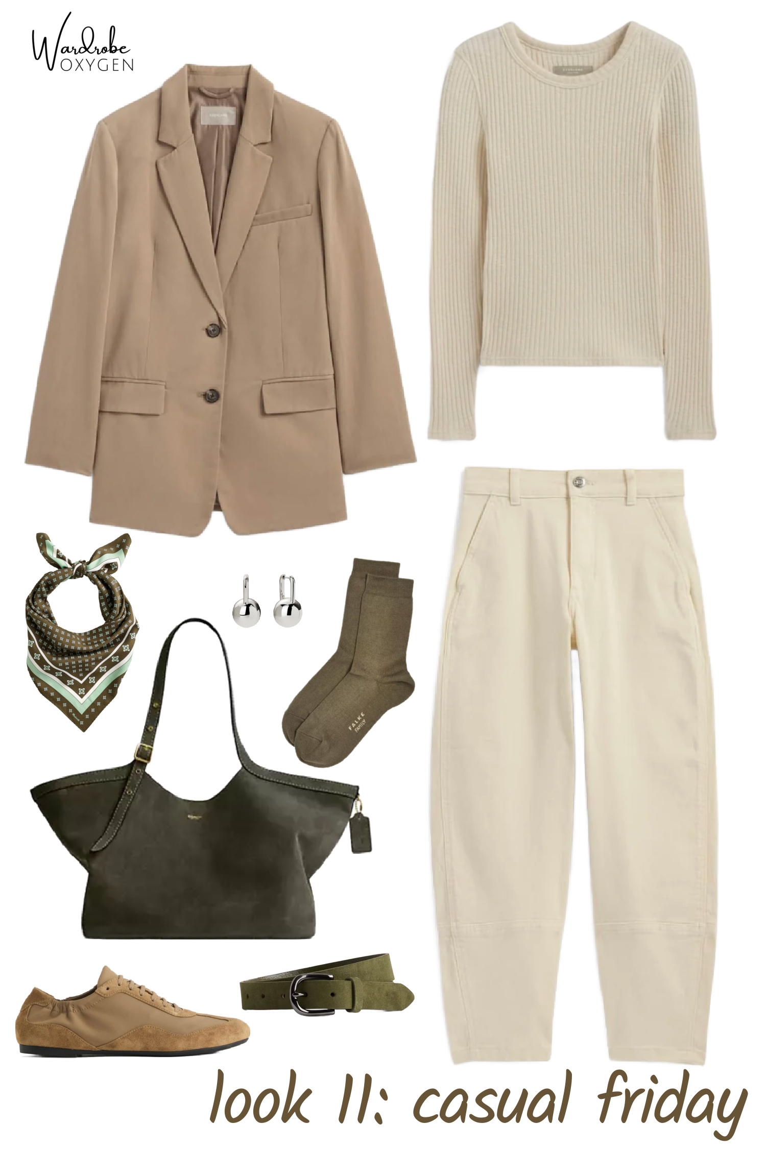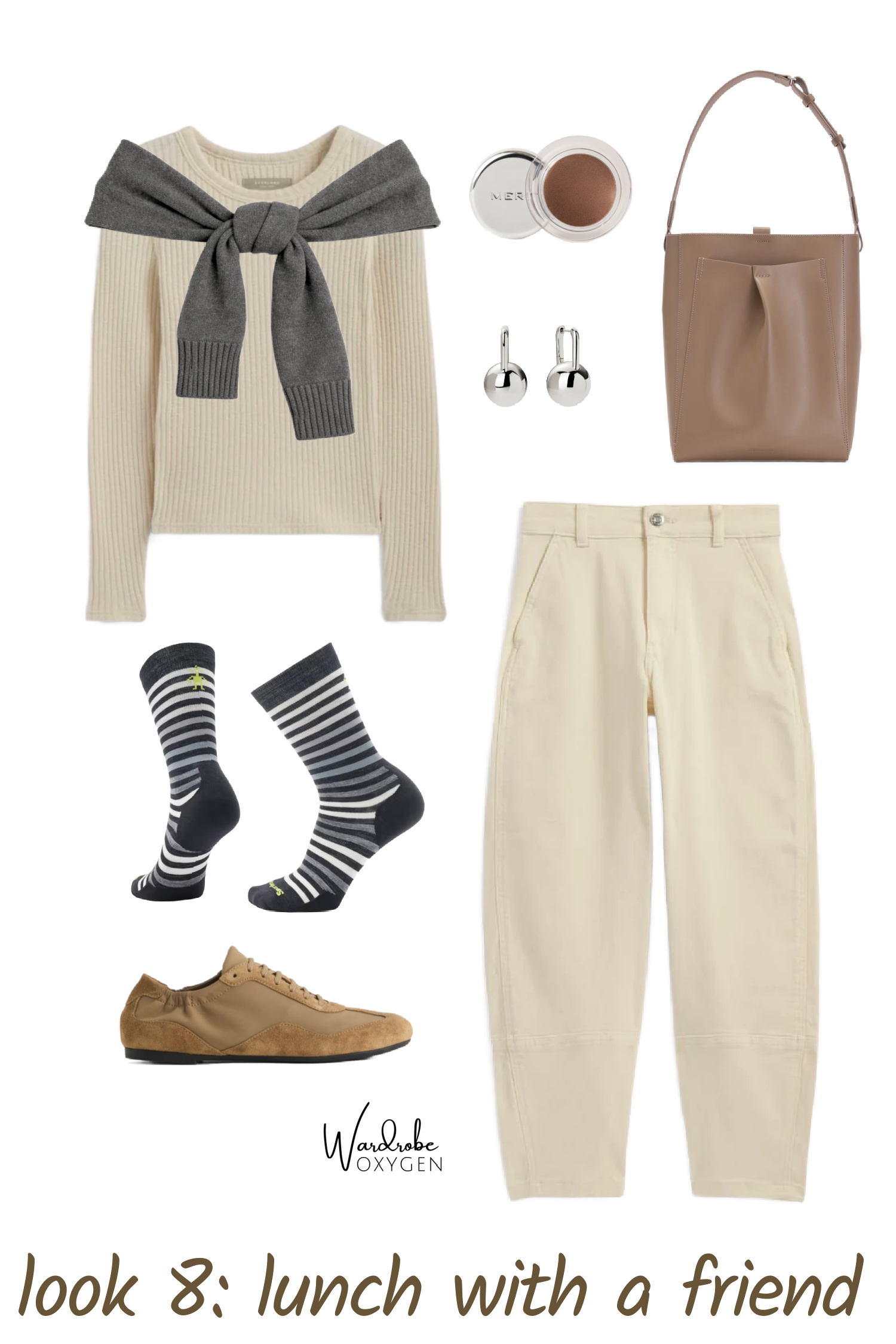 Shop the Accessories: two-tone earrings | silver earrings | silver necklace | beaded necklace | silk scarf | ivory socks | olive socks | stripe socks | sheer socks | glasses | phone case | lip pencil and oil combo | eyeshadow | lip stain | tote | sling bag | suede belt | black belt | white tee