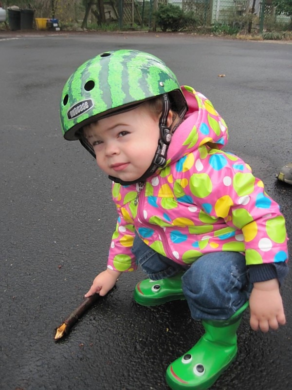 Emerson does know what she wears, and is at an age where she wants to make choices. We will hold up two tops and ask her which one she likes. I have learned that she likes the color purple, the color green, ruffles, and loves it when there is an animal on her shirt. I try to buy these if I can find them on sale because I want her to feel as though she has control over her appearance. In fact, the bike helmet she is wearing above she picked out herself. I put out all the helmets in her size – ones with hearts, ones with skulls, ones with dinosaurs… she chose the one that was green, and looked like “an alligator.”