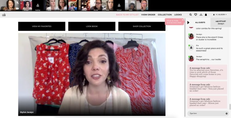 I think many of us are Zoom-weary by this point, so I need to start my cabi Front Row review by stating this is NOT a Zoom meeting. This is cabi technology set up specifically to see and experience the clothes but also have a social experience. There’s no need to download software, cabi Front Row takes place in your Internet browser. There will be a filmstrip at the top of the room of all the attendees, a chat to the right, and then in the center, you will see a larger space where your cabi Stylist manages what you see.