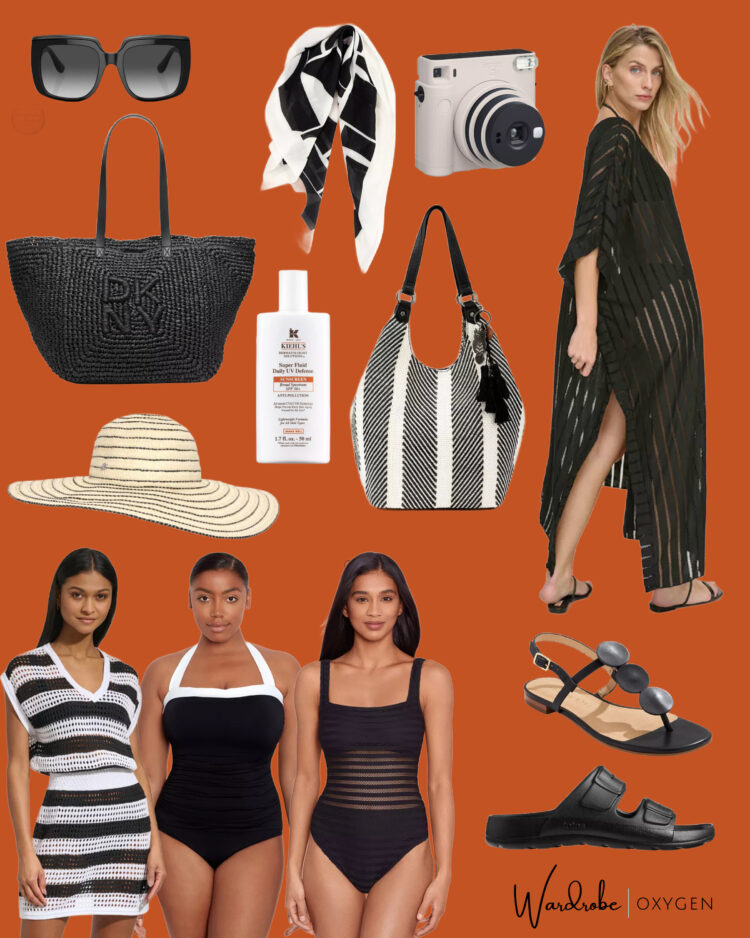 sunglasses | scarf | camera | caftan | black tote | straw hat | sunscreen | black and white tote | black and white coverup (S-XL) | black swimsuit with white trim (4-16) | black swimsuit (4-16) | black sandals with discs | black waterproof sandals