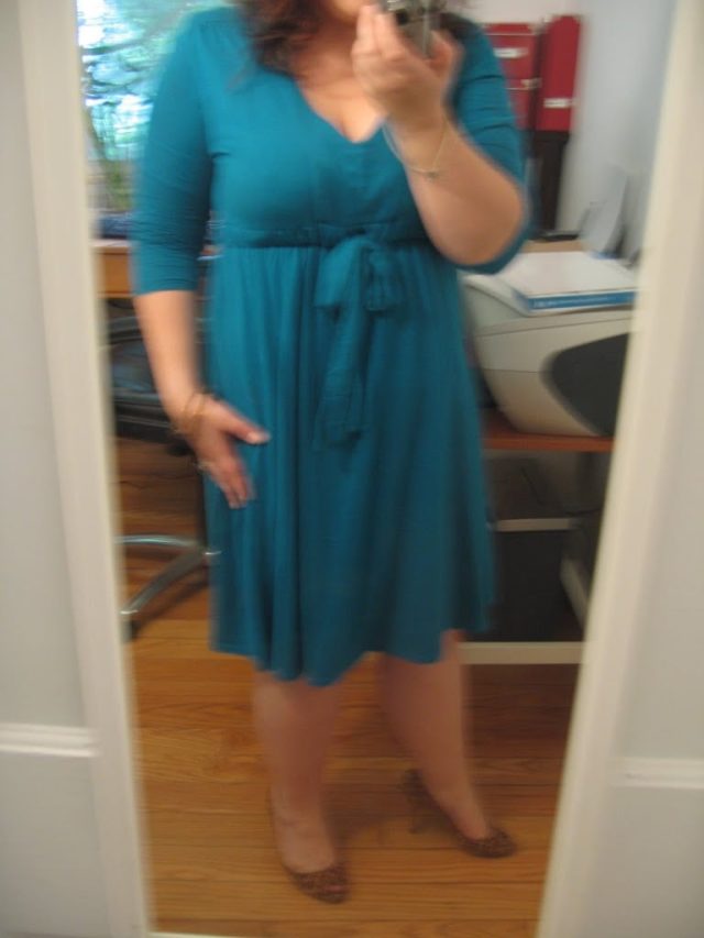 Allie 006Allie 007Teal jersey dress by Proenza Schouler for Target, leopard peep toe heels from BCBGirls, gold bracelets and hoops from the Icing.