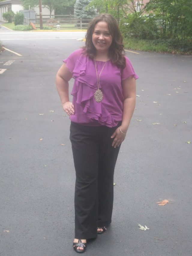 Yes, this is a top I wasn’t sure about keeping. This morning I liked it with black pants and with my black pencil skirt. I think having this neckline does balance it nicely 🙂