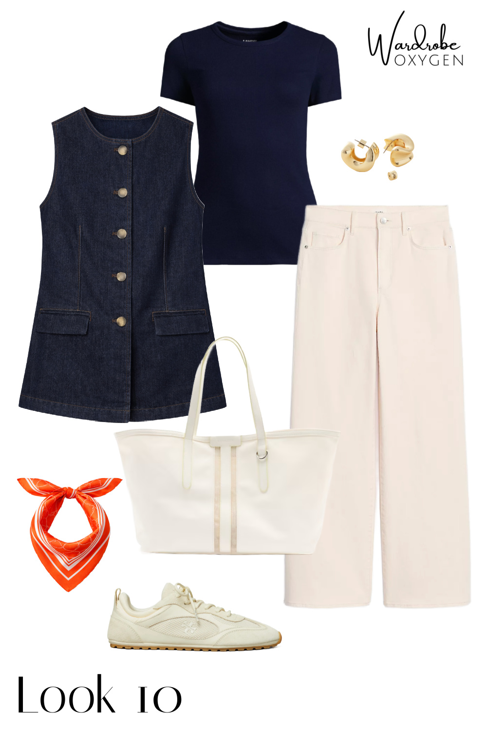 Shop the Capsule: orange shell | navy tee | striped tank | camel blazer | orange cardigan | green sweater | white shirt | striped sweater | denim vest | cropped jeans | camel pants | cream jeans | loafers | sneakers | belt | tote | crossbody | earrings | necklace | scarf