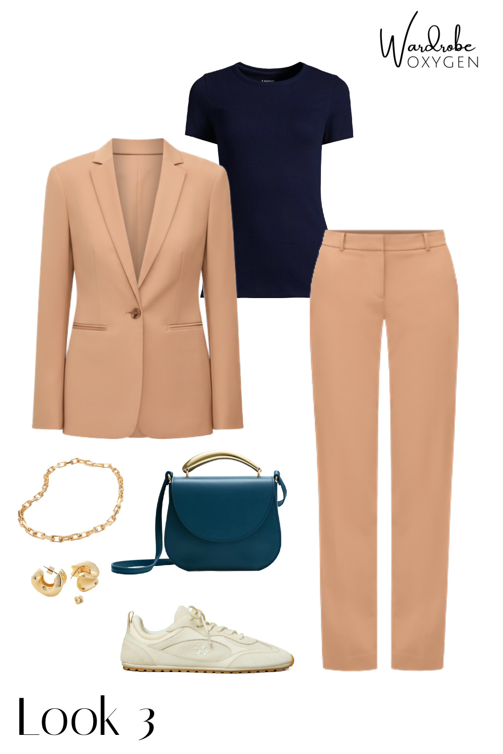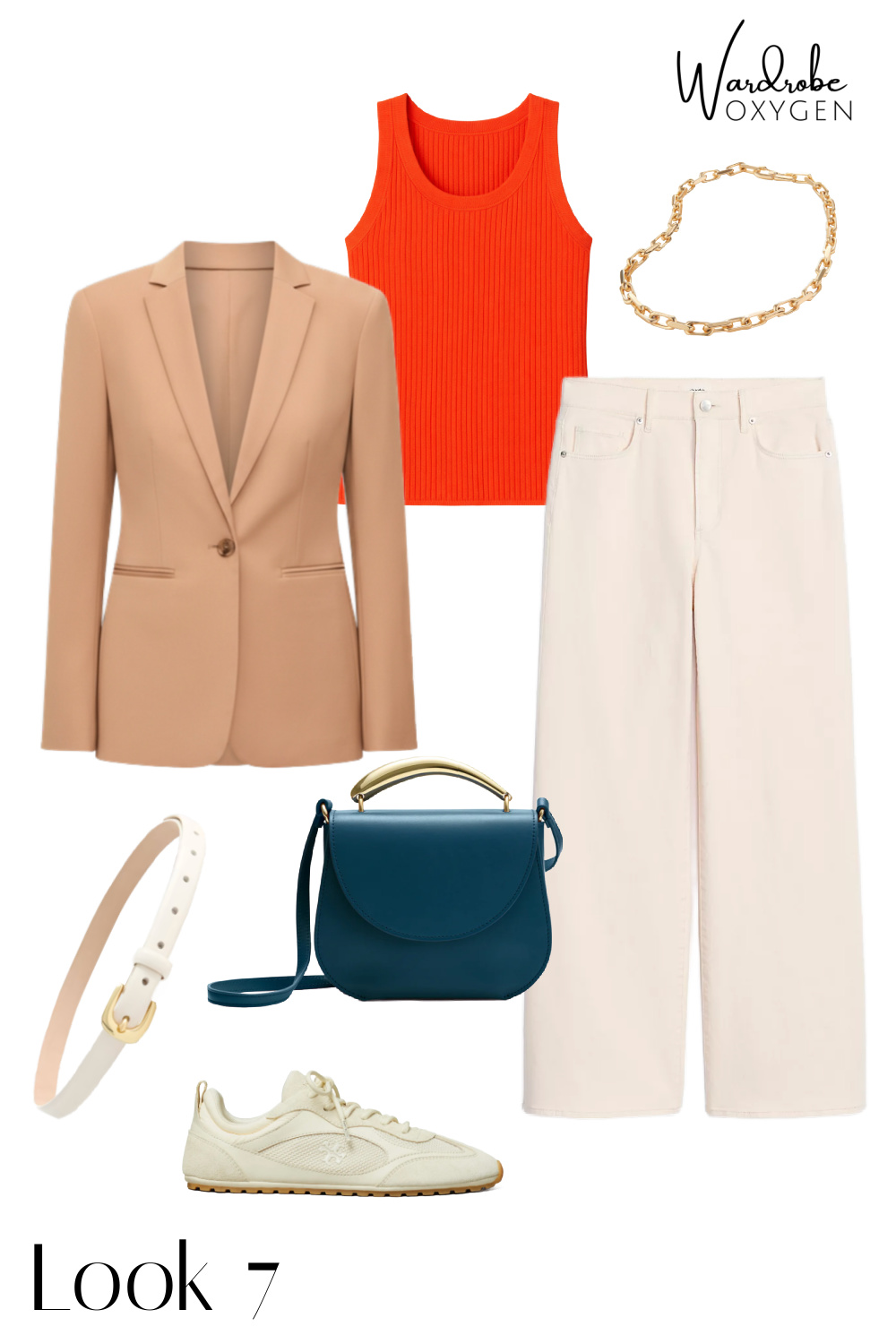 The looks move roughly from most polished (blazer + camel trousers, great for the office or a client meeting) through business casual and casual Friday territory, into true weekend looks anchored by the wide-leg dark denim. By the time you get to the final looks, the blazer is back, but this time with sneakers and a baseball cap, which honestly might be my favorite way to wear it.