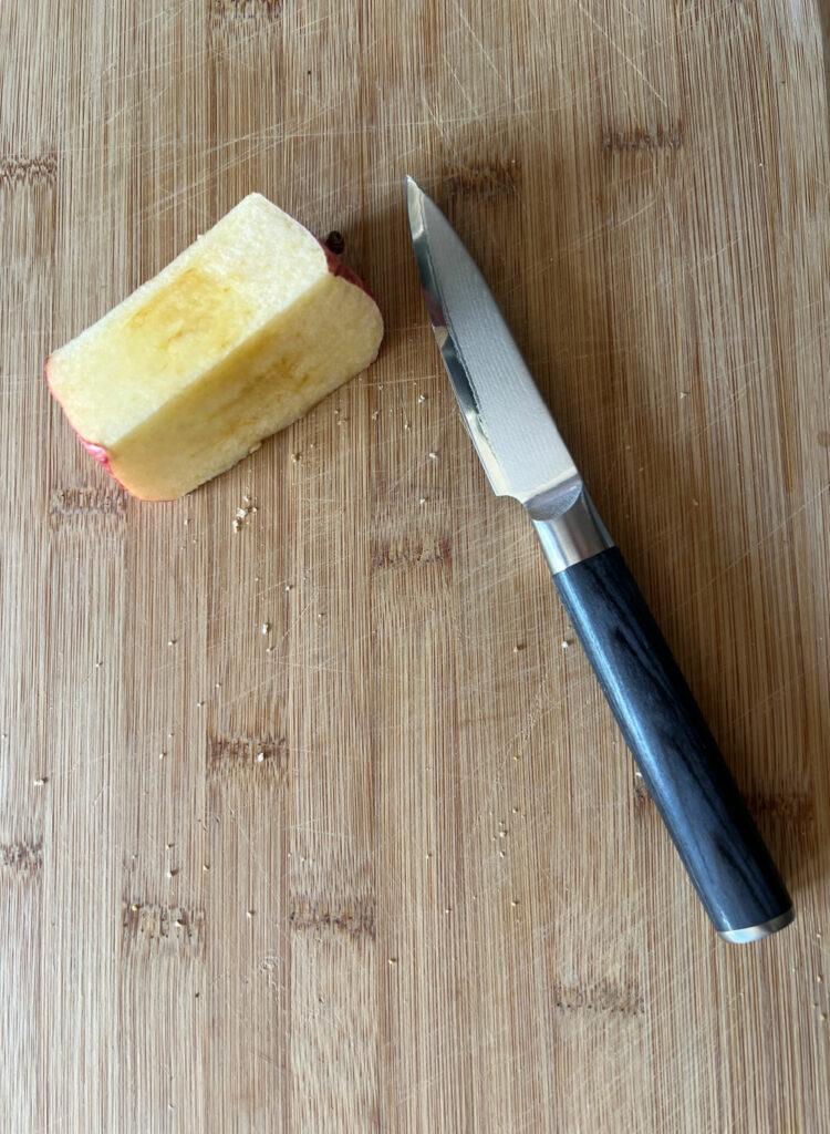 My husband is the primary cook in the family and wanted to try out the Quince Essential Japanese Damascus Steel Knife Set. While we ordered the set, each of the three knives came shipped in its own elegant black box with velvet-covered foam to secure the piece in place. This presentation is so nice, you could totally use this knife set as a gift.