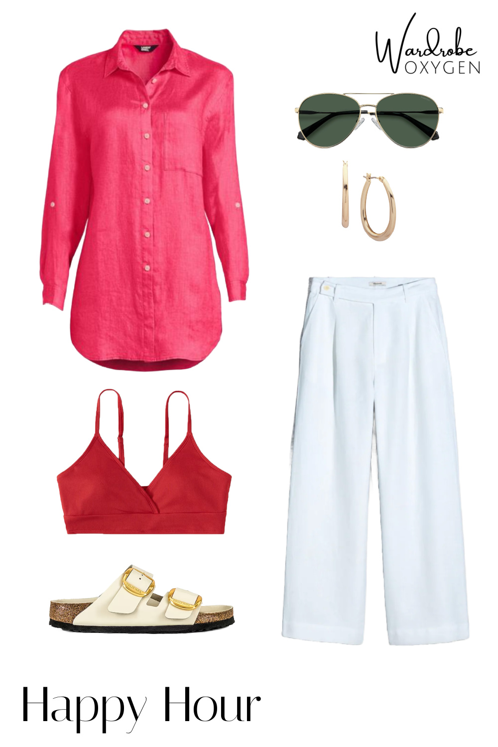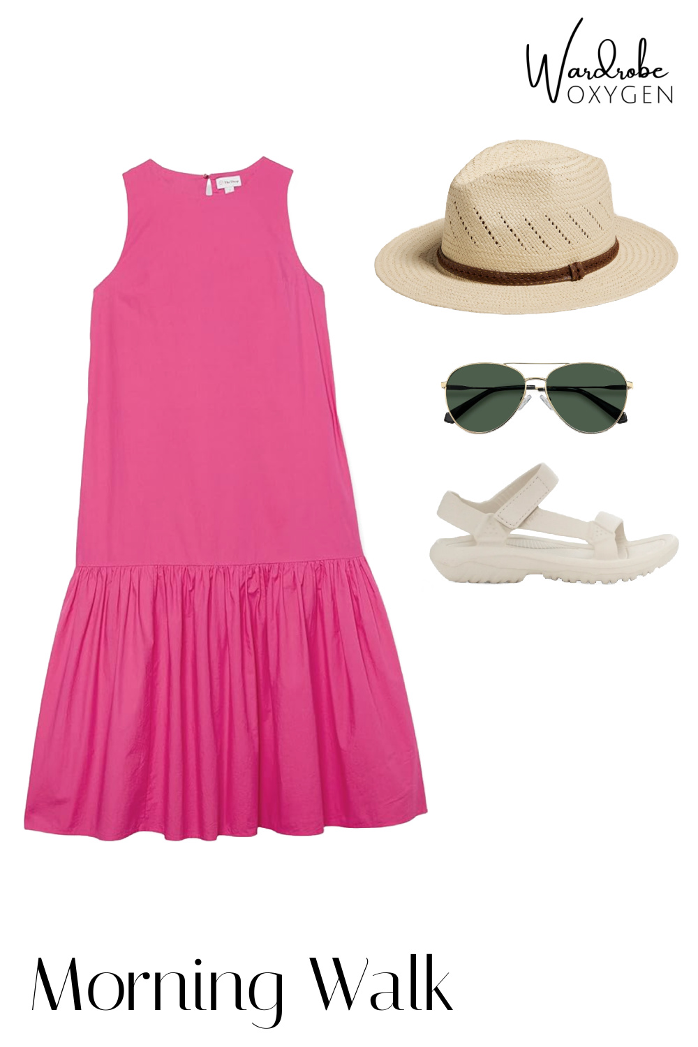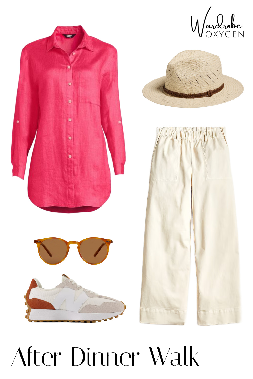 pull-on chinos | white linen pants | straw hat | denim shorts | red active shorts | pink dress (other colors available) | tortoise sunglasses | navy active skort dress | striped poplin shirtdress | striped lightweight sweater | ball cap | white oxford shirt | pink linen tunic | sneakers | white sandals | ecru sandals with gold buckles | navy one-piece suit | red bikini top and matching bottoms | black belt bag | red windbreaker | aviator sunglasses | gold hoops | waterproof tote bag | navy tank | red sports bra | striped rashguard | gray sweater fleece pullover