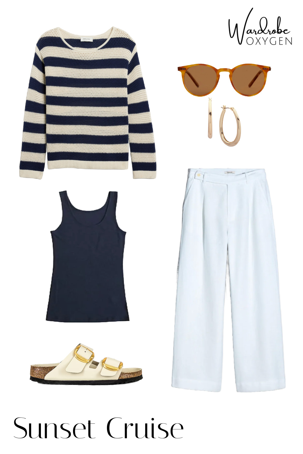 Speaking of layers, you will see pieces get multiple lives. Wear the striped shirtdress as a dress, then layer it as a duster in a different outfit and layer over a swimsuit as a coverup. The sweater can be thrown over the shoulders to add interest, and be ready if it gets chilly after sunset. The linen tunic looks great tied at the waist, buttoned up with denim shorts or cropped wide-leg chinos, and as a swim coverup.
