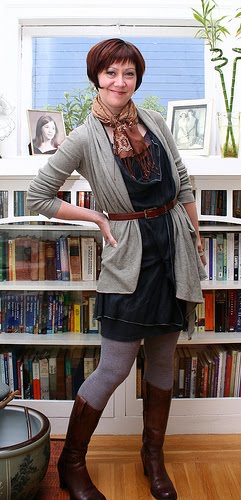 A classic leather belt can be a great choice too, depending on the width and your figure. Look for contoured belts (ones that are cut on a curve, and not like a single strip of material), and don’t go so wide that it will cut into your curves. Wearing such a belt slightly above or below your natural waist will usually make this look be more flattering. Kimberly at Fab Finds Under $50 shows how a classic belt can create a really cohesive look with a cardigan and dress.