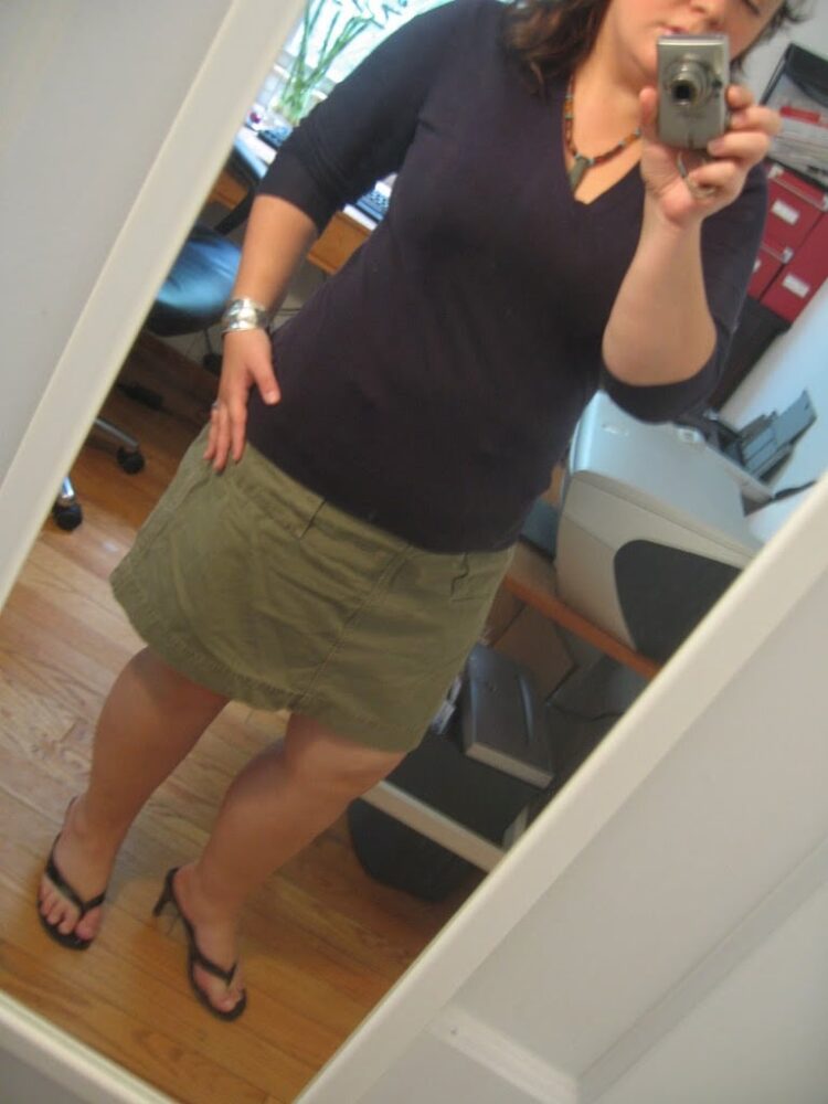 Navy stretchy cotton v-neck sweater from Banana Republic, olive ripstop cotton cargo skirt from J. Crew, black leather thong heels from Mossimo, silver cuff, jade and other bead necklace from the hubby's trip to Mexico, black headband made from the hem of the sleeve of my Jack Daniel's tee. Amazing how my arm is almost the same size as my head… this realization came a few days ago when I found this piece of hem on the floor just outside the office's trash can and it was when I was ironing and the AC wasn't pumping as hard as I desired… now it's a new accessory (and I have been doing light weights every morning along with yoga to get the arms smaller than the noggin). Usually relegated to the bathroom for when I wash my face at night, today it was a necessity for the Real World.