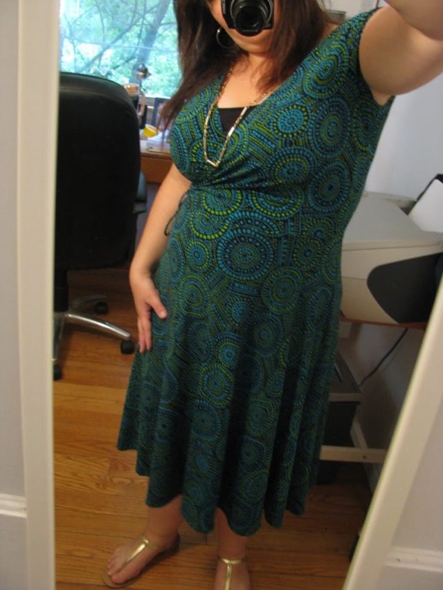 So anyway, on to my clothing. Yesterday was awful – I had a mini meltdown in the morning because nothing fits. Well some things do fit, but they don't work with one another. Can't really wear a black pencil skirt with a tunic-length maternity skirt and not be horrified with myself. So I tried on maternity stuff I have gotten on clarance and it was either still too big or needed to be shortened (hell world – there are a TON of us petite and tall pregnant ladies out there! We don't all work with a 33″ inseam!). So I went to my trusty Maggy London wrap dress. Problem is my “baby bump” is above the belly button right now so I just look pudgy, not pregnant. Oh well.