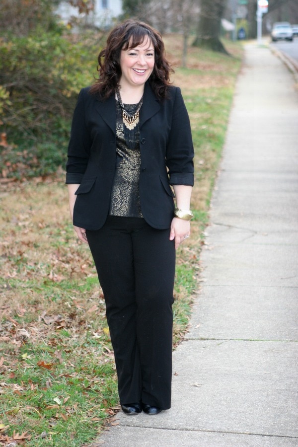 I love Gwynnie Bee for the holiday season – they have so many fun dresses, skirts, and tops with that hint of glitz and glam that is perfect for the office holiday party, a New Year gala, or a fete at your friend's house. This top is a soft stretchy fabric with a nice weight that won't let it cling – perfect with some skinny jeans and heels for a happy hour, or a pencil skirt for a dressier event. I paired it with simple black work separates to make it more day appropriate, and liked adding this necklace to make the gold look more tough.