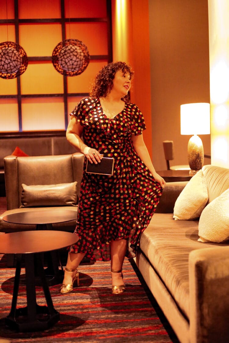 For this look I am wearing this dress from Lane Bryant in size 14 with the Uptown Sandal from Margaux and an old sparkly black and gold box clutch I got from Karl Lagerfeld for Macy's about five years ago. This shoot made me realize this clutch fits my five-year-old iPhone but not my 2021/2022 phone so I am donating it to Uncommon Threads, an organization in Massachusetts that empowers women through fashion. I am now on the hunt for a similar goes with everything clutch as I bet such bags will be on clearance after the New Year!