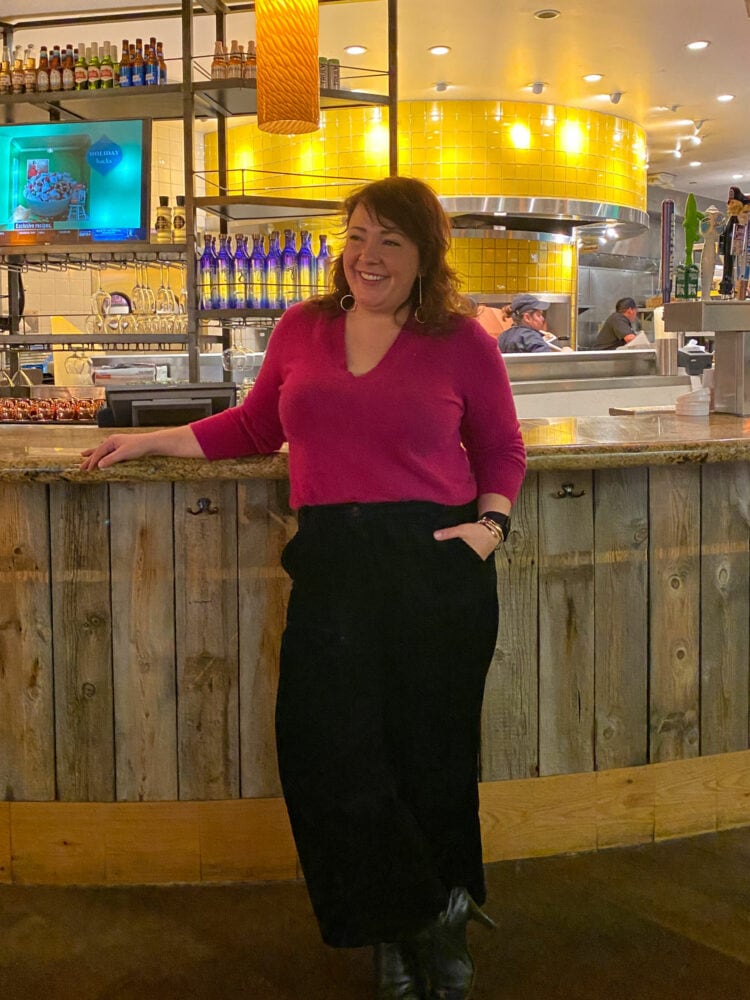 Wednesday I didn't go into the office as I had a lot of errands to do and also took my mom to an appointment about 45 minutes away. I got her to capture my “OOTD” at dinner at the end of the day. I am wearing my Universal Standard cashmere v-neck in size XS with a new pair of corduroy pants gifted to me from Seasalt Cornwall (size 14). I finished the look with the same tall boots from Tuesday slipped under the cropped pants and my now-discontinued Jenny Bird Medium Edie hoops in gold.