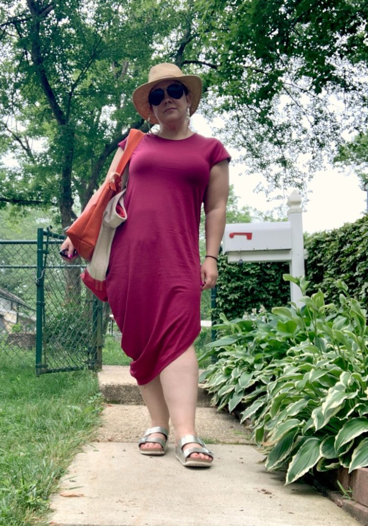 I call this look, “Sick, but make it fashion.” I've had a cold for almost two weeks. One day I'll feel fine and the next I feel like death warmed over. This was one of those death warmed over days yet I still had things I needed to do that required me to leave the house. I now have three of this dress from Universal Standard (XS Petite). You can see me wear the blue one in this post. They're so great because they seem more stylish than a standard t-shirt dress and the asymmetrical cut makes the dress fall away from the belly, showing less of your shape without looking like a sack. Again, the silver Birkenstocks, the silver Jenny Bird hoops, and the same orange Clare V. tote seen in the first photo (plus an XL Lands' End tote for grocery shopping). To hide my sick face and too sick to style hair, my Ray-Ban 62mm aviators (on sale) and a hat from Banana Republic (old; this looks similar).