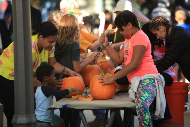 After that it's set up for carving for older kids and adults. The community sets up buckets to collect pumpkins guts to compost, there's clowns, magicians, and bands performing, and businesses in the town center offer cookies, candy, popcorn, and cider for free snacks.