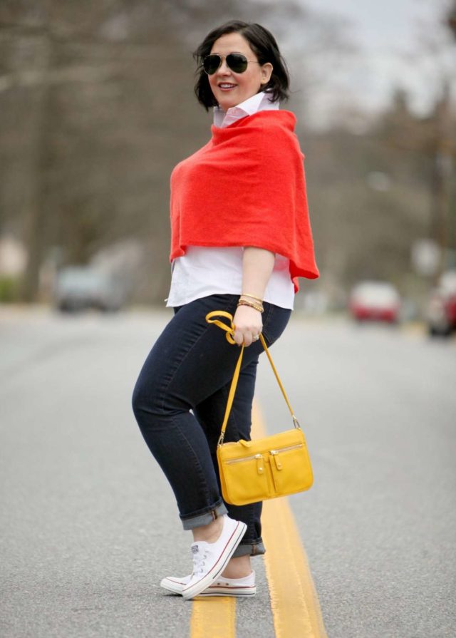 For a day playing tourist with the family, I look for pieces that have stretch, resist wrinkles, are polished enough for lunch at a sit-down restaurant, but are comfortable. This cashmere wrap from Purple Poppy is the perfect topper because it's warm without being bulky; when the sun comes out I can tie it around my purse strap without any issue. A cross-body is a must to have hands free to take pictures, hold a coffee, or Emerson's hand. I got this one from Talbots last season; I liked their version for this year too, and many other brands also carry bags of this size that have detachable straps. A white shirt is a great piece to have; this one from Lands' End is their oxford so it's opaque and doesn't look sloppy if it gets a few wrinkles. These jeans from Gap are my absolute favorite – a dark wash, a straight versatile fit. This look is a great example of the direction my wardrobe is going – simple pieces with lots of versatility, stylish without being trendy, yet fitting with my personality. These are pieces I grab for on a regular basis, I'd be sure to pack if I was going on vacation, and would be likely to wear if I was going sight-seeing in DC this spring.